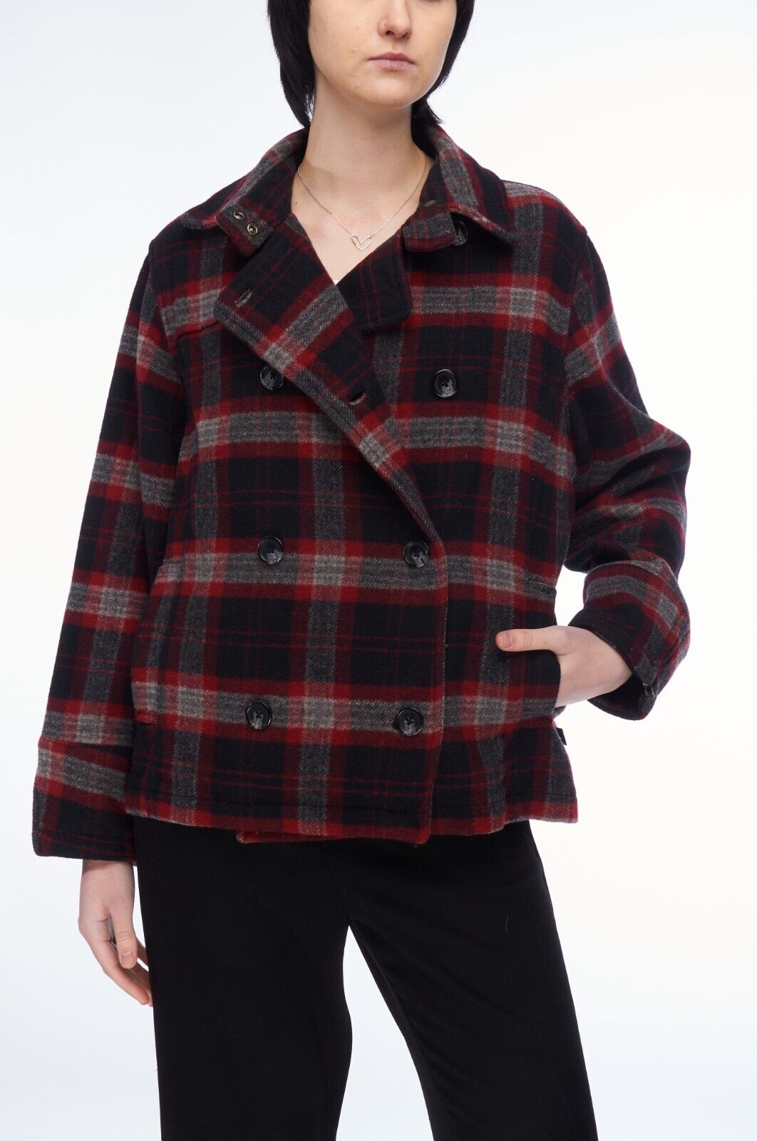WOOLRICH Short Coat Red Black Plaid Wool Women's Double Breasted Size M